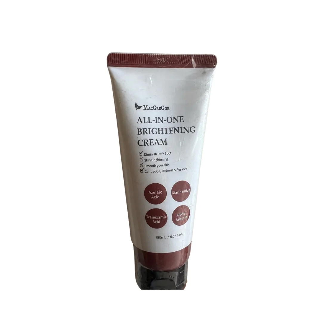All-In-One Brightening Cream by MacGregor is a multi-benefit moisturizer designed to help even out skin tone and boost radiance while delivering lasting hydration. This all-in-one formula works to soften, brighten, and nourish skin, leaving it feeling smooth, refreshed, and more luminous with regular use.