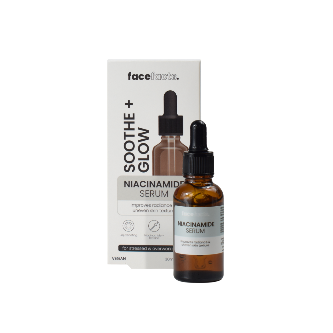 Smooth, clarify, and balance your skin with Face Facts Niacinamide Serum. This lightweight serum is formulated with niacinamide to help reduce excess oil, minimize pores, and even out skin tone. Fast-absorbing and gentle, it blends seamlessly into your skincare routine, leaving skin feeling refreshed, soft, and balanced. With consistent use, your complexion appears clearer, healthier, and more radiant.