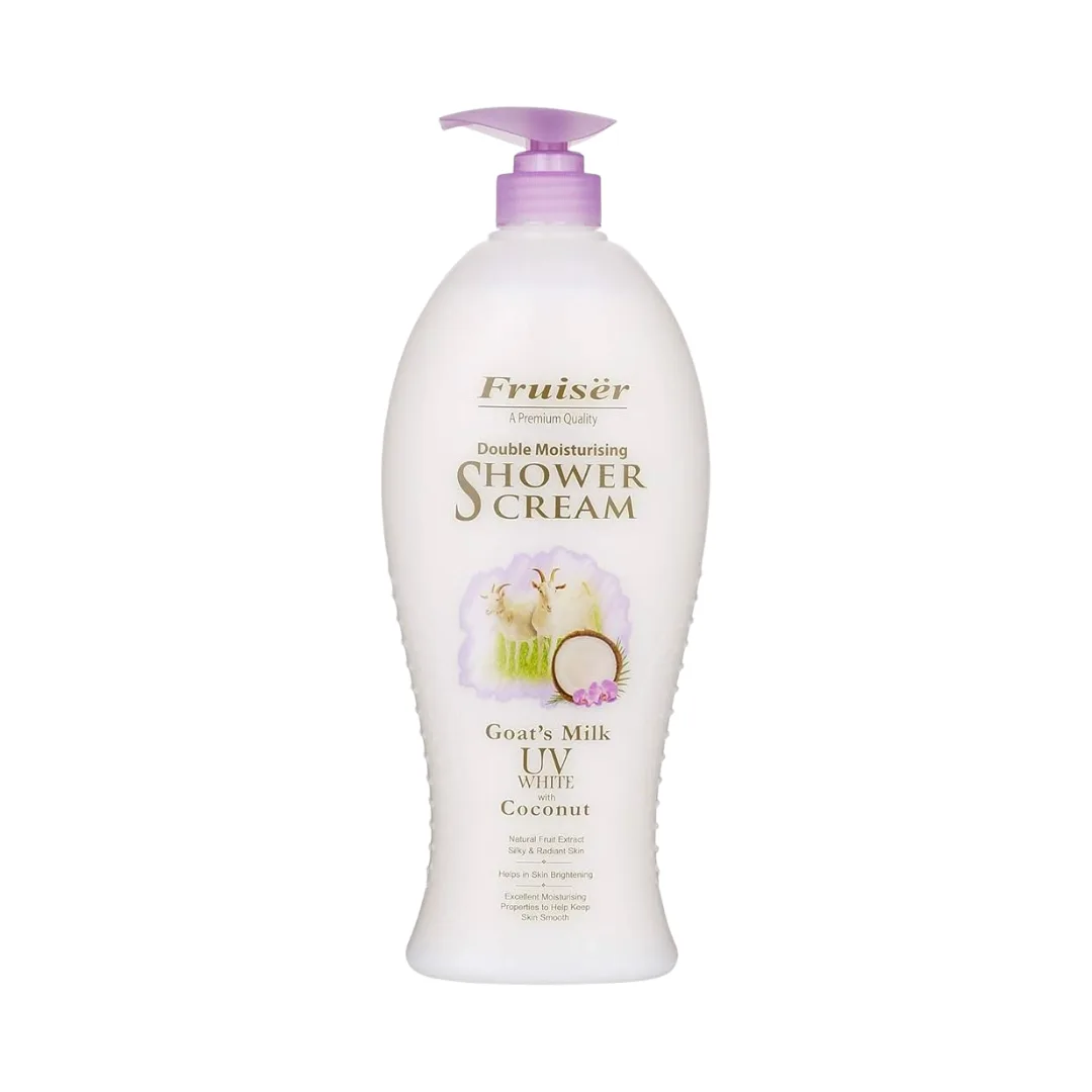 Fruiser Double Moisturising Shower Cream pairs the nourishing benefits of goat milk and coconut to gently cleanse while deeply hydrating your skin. This rich shower cream helps soften dry skin, leaving it feeling smooth, refreshed, and comforted after every wash. It supports a clean, radiant look without stripping moisture, making it perfect for daily shower routines.