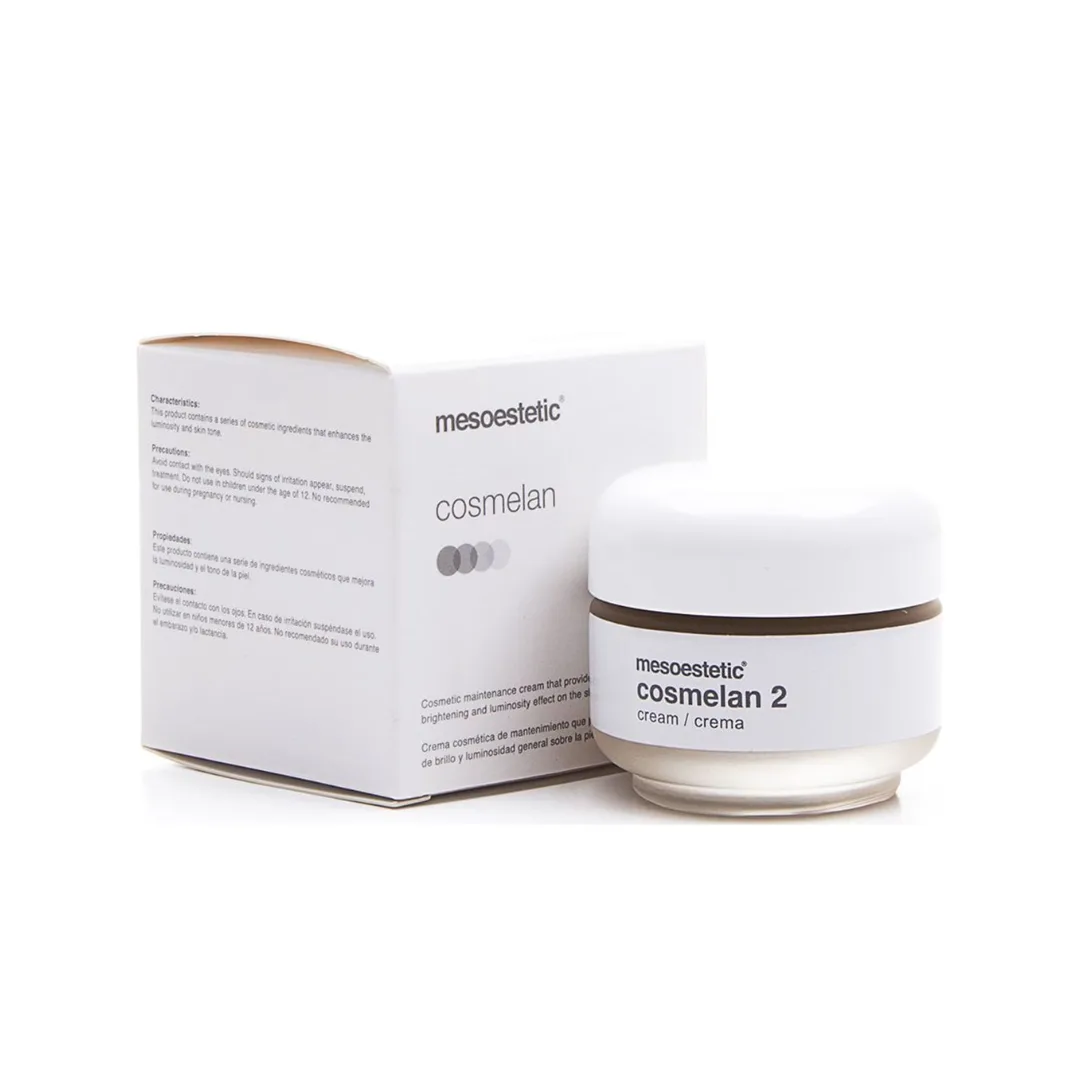 Mesoestetics Cosmelan 2 is a professional‑grade depigmentation cream formulated to reduce and control dark spots and uneven pigmentation on the face. It works by regulating melanin production to visibly diminish hyperpigmentation and help prevent new spots from forming over time. It also improves skin texture, enhances brightness, and helps unify skin tone for a more radiant, rejuvenated appearance.
