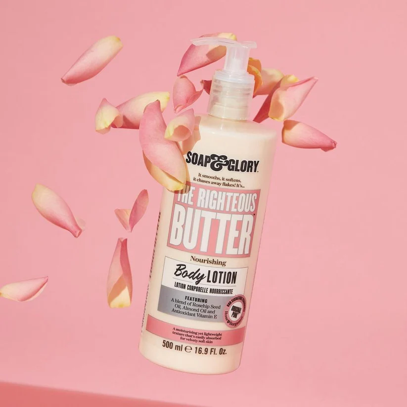 Soap & Glory The Righteous Butter Nourishing Body Lotion 500ml is a rich, indulgent moisturizer designed to deeply hydrate and soften even the driest skin. Infused with shea butter, aloe vera, and vitamin E, it delivers long-lasting moisture while leaving a smooth, non-greasy finish. Lightly scented with Soap & Glory’s iconic Original Pink™ fragrance, it pampers your skin and senses with every use.