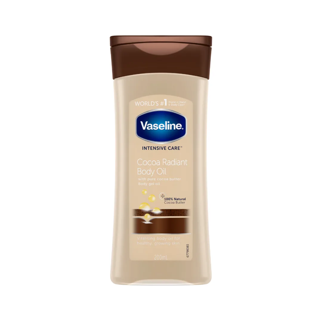 Vaseline Intensive Care Cocoa Radiant Body Oil is a deeply nourishing body oil that helps lock in moisture and reveal softer, smoother skin. Infused with micro‑droplets of Vaseline Jelly and cocoa butter, it absorbs quickly to hydrate dry skin while enhancing its natural glow. The lightweight, non‑greasy finish makes it easy to use after bathing or anytime your skin needs a radiant boost.
